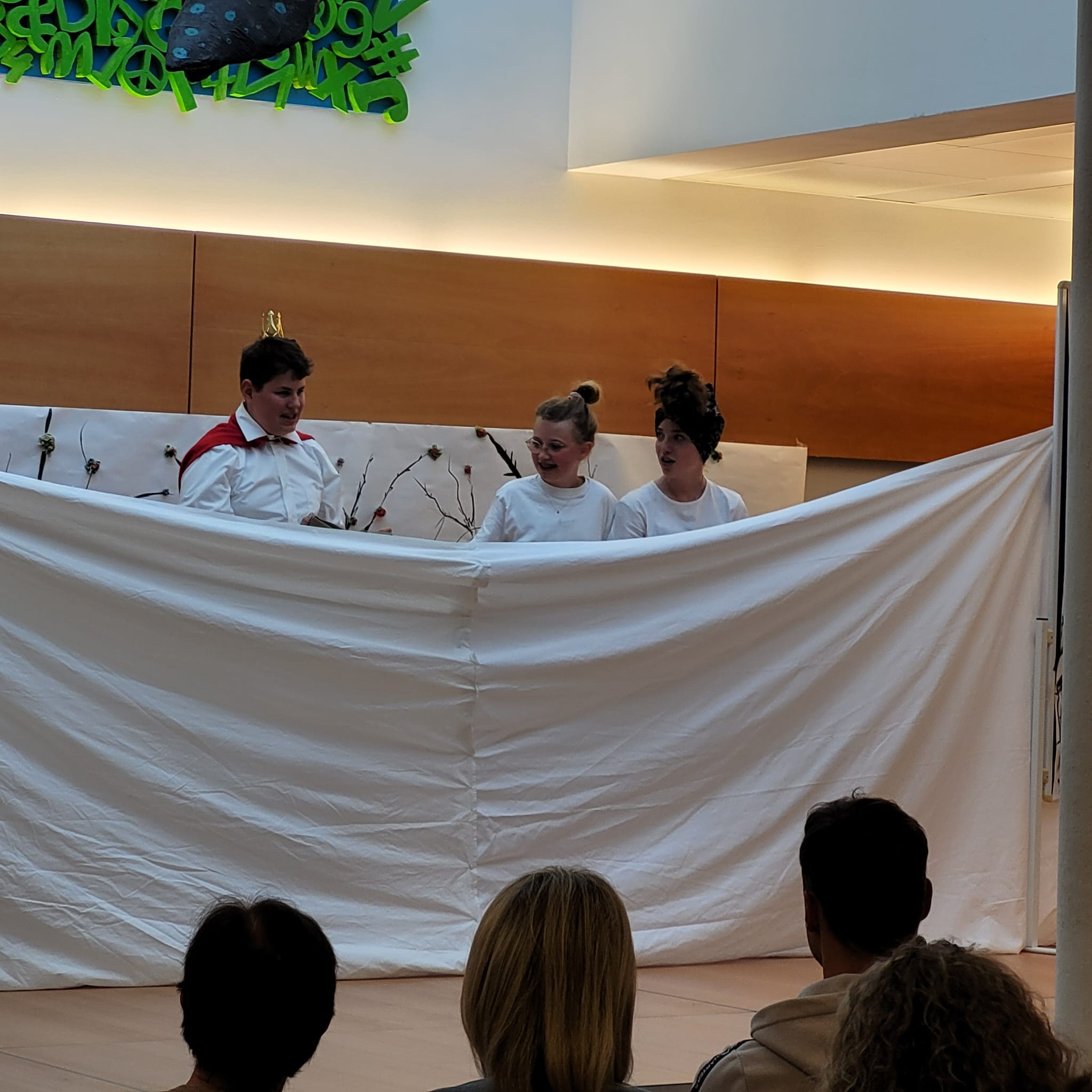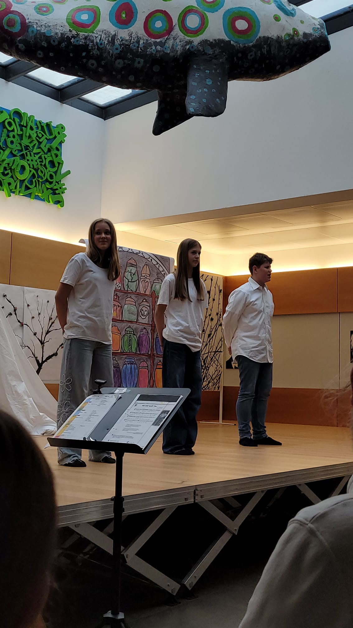 Die Musik-Kreativ-Theater-Gruppe der 3. Klassen unterhielt das zahlreiche Publikum mit Songs wie "Riptide", "Set fire to the rain", den beiden von Frau Nemes adaptierten Titel "Phänomen" und "Ich bin so schön", die sich beide auf den soooo schönen Märchenprinzen in dem darauffolgenden Sketch "Aschenputtel einmal anders", bei dem die Lachmuskeln des Publikums stark strapaziert wurden, bezogen. "La Bamba" und "Mama Mia" brachte das Atrium zum Kochen und der "Zauberlehrling-Song", in dem Bezug auf die weltbekannte Ballade genommen wurde, leitete über zum Theaterstück "Chaos im Zauberlabor", in dem der unerfahrene Zauberlehrling Max seiner besten Freundin Chantal imponieren möchte und letzten Endes eine Hexe, ein Monster, Wassergeister und einen Besen herbeiruft. Nur der gestrenge Zaubermeister kann Schlimmeres verhindern und Max und Chantal dürfen die Überschwemmung im Zauberlabor in stundenlanger mühsamer Arbeit als Strafe beseitigen. Musikalisch folgte Queens "We will rock you" mit Trommeln begleitet. Besonders berührend war die Darbietung von Lady Gagas "Shallow", bei der die Schüler*innen Emma Dirnberger, Marlene Gastberger und Elias Klabacher mit ihrem Können und vor allem mit ihren Stimmen begeistern und berühren konnten.