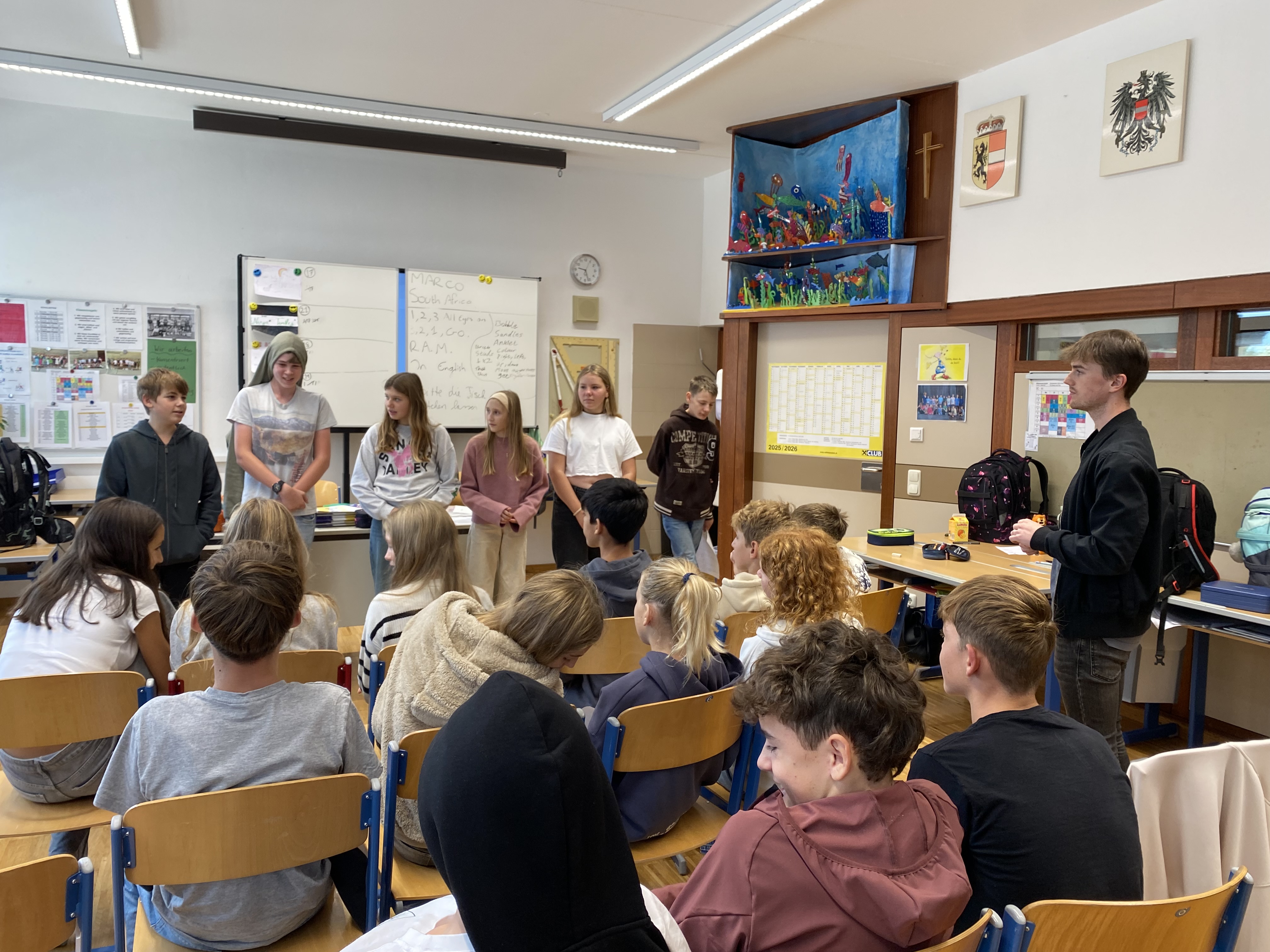 Gleich in der vierten Schulwoche starteten die 3. Klassen mit einem tollen Englischprojekt. Ziel dieser Intensivsprachwoche war es, die ganze Woche nur Englisch zu sprechen und so die eigene Sprachkompetenz zu erweitern. Die drei Muttersprachler von HELLO ENGLISH boten abwechslungsreiche language games, Rätsel und auch eine Bewegungseinheit mit englischen Spielen an. Die Schüler und Schülerinnen studierten gemeinsam in Gruppen verschiedene Szenen ein, die am letzten Tag vor den Klassenkameraden und Lehrern präsentiert wurden. Dabei zeigten die Kinder großes Engagement und hatten sichtlich viel Freude.