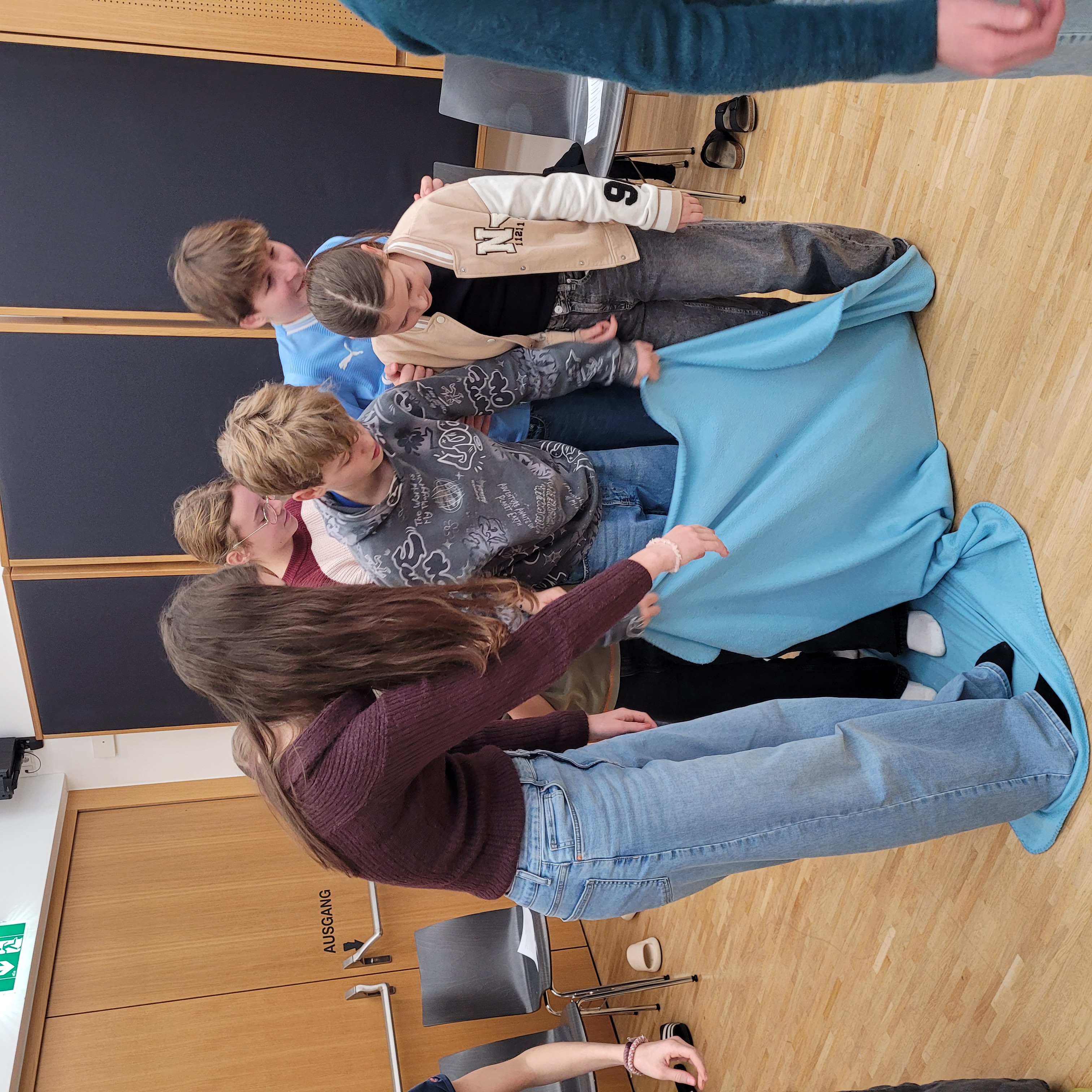 Ein zentrales Element der Stunde war das Kooperationsspiel „Fliegender Teppich“. Dabei waren Teamfähigkeit, Kommunikation und gegenseitige Unterstützung gefragt. Die Schülerinnen und Schüler konnten ihre sozialen Kompetenzen aktiv unter Beweis stellen und gleichzeitig erfahren, wie wichtig Zusammenarbeit und Vertrauen innerhalb einer Gruppe sind.